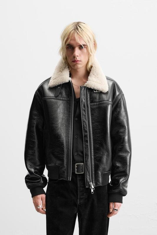 Ціна 4080 Куртка стандартного крою з блискучої тканини з ефектом шкіри з контрастною внутрішньою частиною під ефект хутра. Відворотний комір і довгі рукави. Прорізні кишені на стегнах. Деталь внутрішньої кишені. Передня застібка-блискавка. Чорний | 3548/705