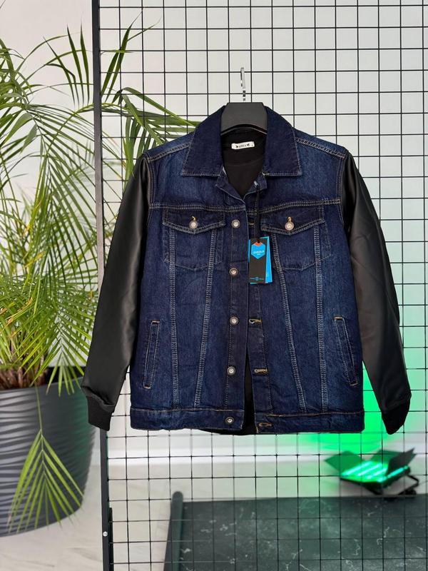 Чоловіча синя джинсова куртка з шкіряними рукавами модна чоловіча джинсовка відмінної якос...