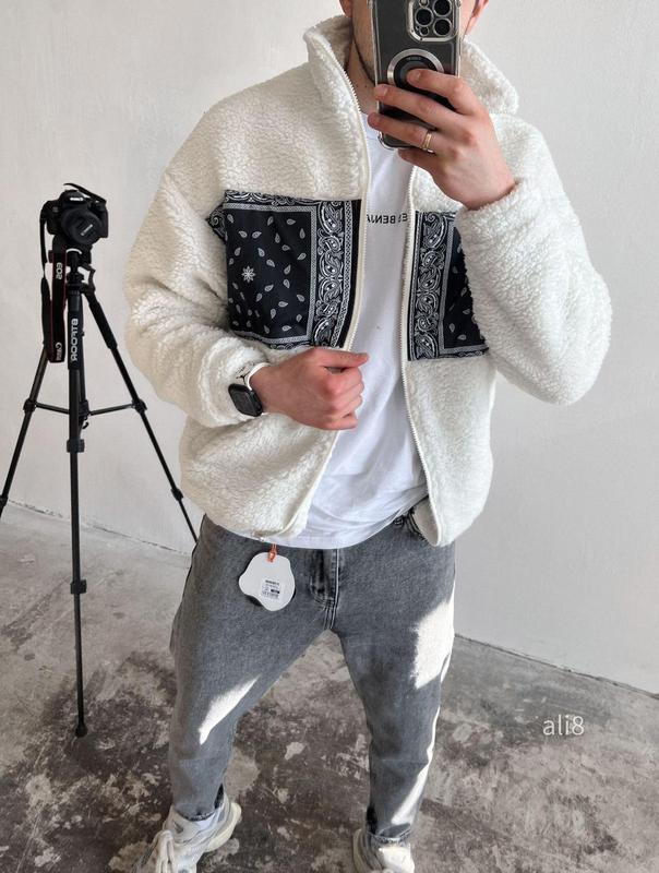 Чоловічий білий плюшевий бомбер з принтом модна чоловіча легка куртка бомбер