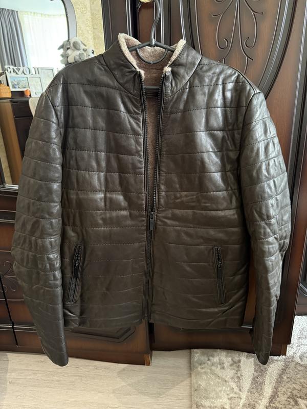 Натуральна шкіра. Утеплювач+хутряна підкладка. Розмір M-L. Не затерта (намагалася передати на фото), без нюансів. Колір темний хакі-зелений