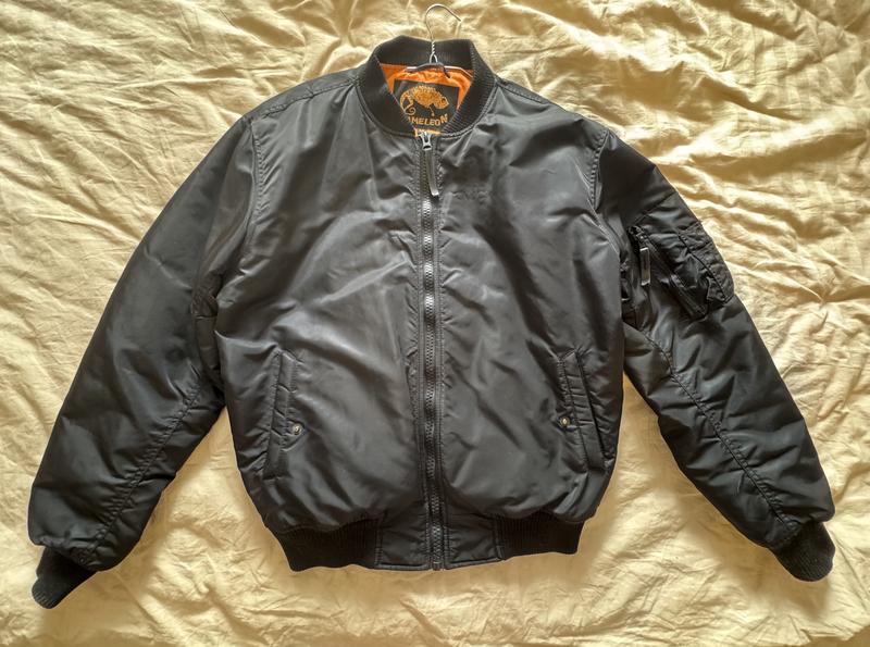 Чоловічий теплий бомбер українського бренду Chameleon. Розмір М. В хорошому стані. В ідеальному стані фурнітура, резинки, підкладка. Є незначні сліди від значків (останнє фото) - практично непомітні. Осінь/зима/весна