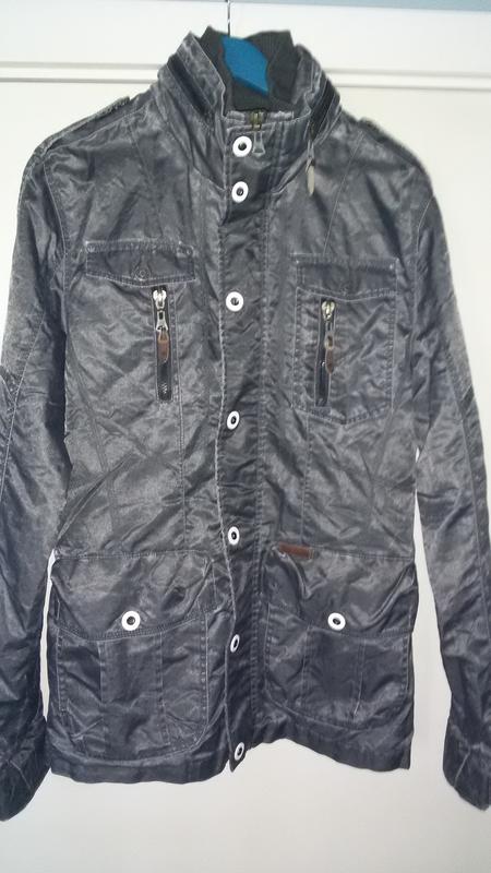 Куртка на осінь-весну,без утеплювача. Підкладка трикотаж. Колір темний сірий з потертостями під вінтаж. Стан нової. Капюшон складається в комірець.Рукав на манжеті Безліч кишень. Вигляд суперовий Заміри : -обєм грудини -114-116 -В поясі-110 -довжина-76 -довжина рукава-70 -лінія плеч по спинці-49см Водо-вітро непрникнена 100 % нейлон підкладка 65%поліестер,35% котон Розмір М - 46, але може підійти на 48