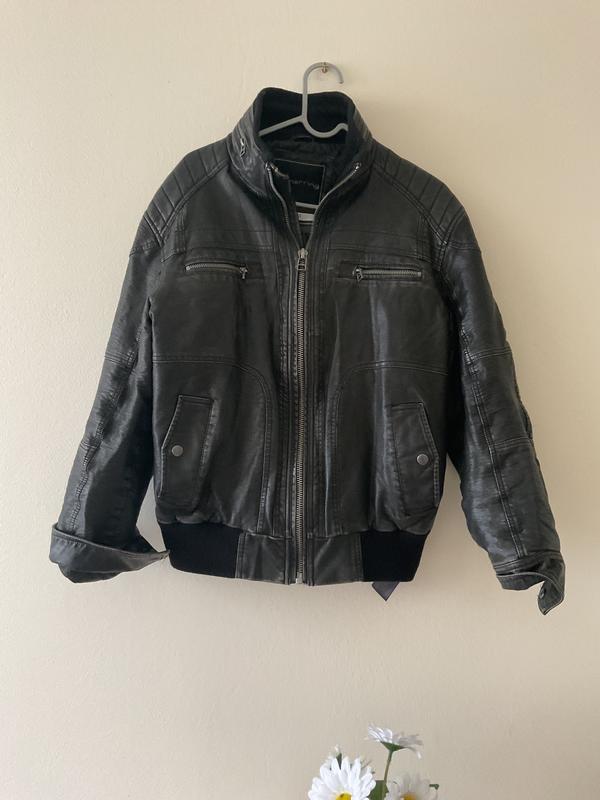 Куртка із шкірзамінника на 46-48 розмір. Дивіться по замірах: в плечах 52 см, між пахвами 60, довжина 60. Зверху екошкіра ( поліуретан), підкладка з віскози. Гарний стан, блискавки без дефектів. Внизу на резинці, яка тягнеться. Пропонуйте свою ціну.