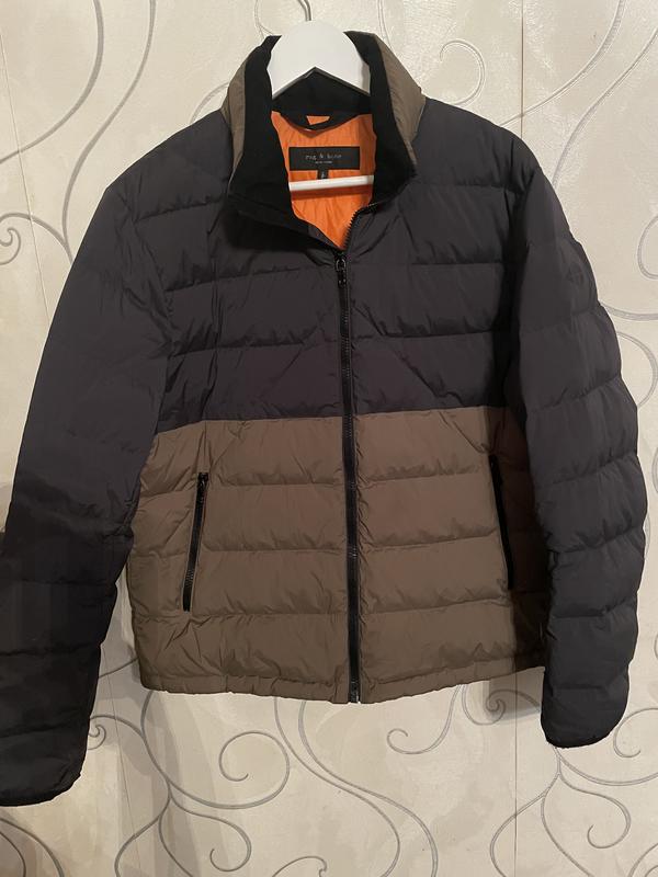 Чоловіча куртка дорого бренду Rag&Bone оригінал. Пухова куртка. Застібка на кнопки на капюшоні. Комір-стійка. Застібка на блискавку. Кишені на блискавці на талії. Шнурок банджі на подолу. Еластичні манжети. Накладні кишені на повній підкладці помаранчевої внутрішньої частини. Чорна фурнітура. Наповнювач: 70% качиний пух 30% перо. Колір верхня частина темно зелена, низ сірий. Ціна в магазинах від 500S