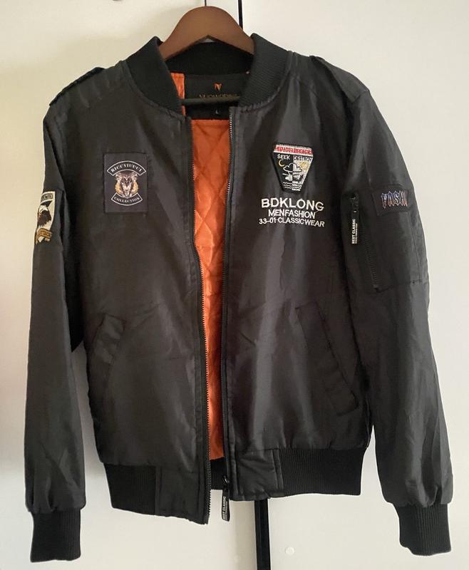 Чоловіча (унісекс) куртка-бомбер чорного кольору, утеплена у відмінному стані. Зручна та стильна, підійде на підлітків. Має стильні нашивки. Заміри: ширина плеч - 45 см, довжина виробу - 70 см, довжина рукава з манжетом - 63 см.