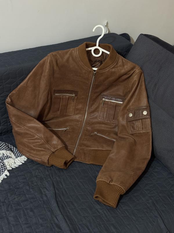 Хороша куртка бомбер. З кишенями на замках Фурнітура YKK. По бірці пише, що це козяча шкіра і манжети шерстяні Розмір 42 (приблизно S) Плечі 41 Підмишки 52 довжина 57 Рукав від плеча 65