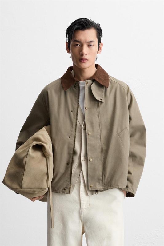 Бавовняна куртка вільного крою з оксамитовим ефектом. Контрастний комір, довгі рукави, кишені з обшивкою спереду й кишеня всередині. Застібається на приховану під планкою блискавку та кнопки. Рукав від плеча 77 Рукав від пахви 49 Груди 63 Довжина 65