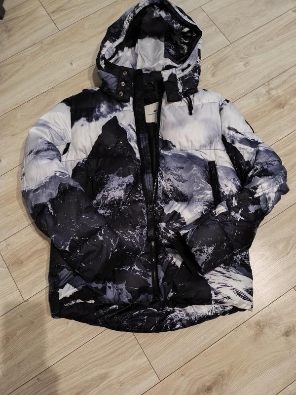 Чоловіча зимова куртка Tom Tailor колір чорно-білий, цікавий малюнок Тепла, підійде для холодної зими Стан дуже хороший, розмір вказано XL, орієнтуйтеся на заміри Довжина по спинці перед/зад - 71/78 см Ширина під руками - 63 см Довжина рукава від горловини - 80 см (13 см плече + 67 см рукав) присутні манжети Плечі - 50 см Замки робочі, дуже зручні масивні, кишені досить вмісткі, всередині + одна кишеня на липучці, капюшон відщіпається.