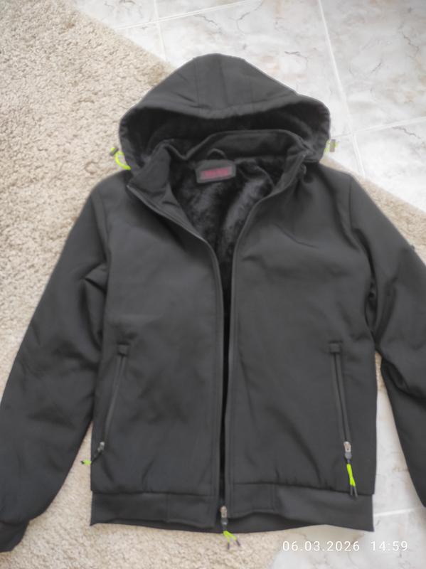 куртка чоловіча чорного кольору, в дуже гарному стані, всередині утеплена штучним хутром, капюшон знімається, розмір XL, довжина куртки 72 см, ширина 63 см, рукав 68 см, кармани на замках.