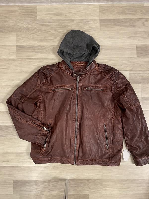Куртка з високоякісної екошкіра від Angelo Litrico. Дуже цікаво виглядає поєднання екошкіра та трикотажного елемента - капюшона. У куртки красивий бордово-коричневий колір. Як завжди, дизайнер приділив особливу увагу деталям вироби. Фурнітура брендована. Ексклюзивна річ, без сумніву. Заміри: пахвами 73 см; низ 65 см; рукав 68 см; довжина 72 см; плечі 57 див.