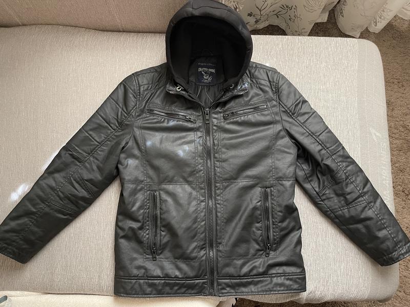Куртка з непромокаючої тканини. З легким утеплювачем. Знімний каптур. Ширина під пахвами 56 см Ширина куртки внизу 54 см Довжина рукава від ворота 72 см Ширина плечей 46 см Довжина куртки від плеча 63,5 см Підкладка ціла. На лівому рукаві нашивка. Стан нової речі.