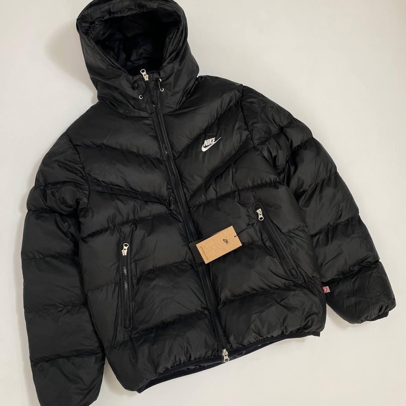 Колір: чорний Матеріал: щільна водовідштовхувальна тканина Утеплювач: синтетичний пух (легкий та теплий) Капюшон зі шнурками для регулювання Двостороння блискавка Бічні кишені на блискавках Логотип Nike на грудях ✨ Пуховик чудово поєднується як зі спортивним, так і з повсякденним стилем. Підходить для зими та пізньої осені.