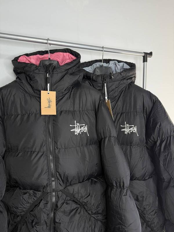 Зимовий унісекс пуховик stussy чорного кольору з рожевим та сірим капюшоном в середині