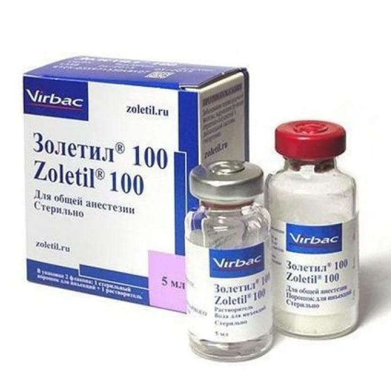 Золетіл - засіб для ін'єкційної загальної анестезії (наркозу). СКЛАД І ФОРМА ВИПУСКУ Лікарський засіб у формі ліофілізованого порошку для ін'єкцій білого або світло-жовтого кольору в комплекті з розчинником (вода для ін'єкцій) випускається в скляних флаконах, закупорених хлорбутаноловыми пробками і загорнених алюмінієвими ковпачками. Кожен флакон містить в якості діючої речовини: 250 мг тилетамина гідрохлориду 250 мг золазепама гідрохлориду. Допоміжні речовини — натрію сульфат і лактоза. ФАРМАКОЛОГІЧНІ ВЛАСТИВОСТІ Тилетамин — загальний анестетик диссоциативго дії, викликає виражений аналгетичний ефект, але недостатнє розслаблення м'язів. Тилетамин не пригнічує глотковий, гортанний, кашльовий рефлекси, не пригнічує дихальну систему. Золазепам пригнічує підкіркові області мозку, викликаючи анксіолітичну та седативну дії, розслаблює поперечнополосатую мускулатуру. Золазепам посилює анестетическое дію тилетамина. Він також запобігає судоми, викликані тилетамином, покращує м'язову релаксацію і прискорює відновлення після наркозу. Час настання анестезії після внутрішньом'язового введення індивідуально, тому після ін'єкції препарату слід встановити ретельне спостереження за твариною. У кішок початок дії препарату після внутрішньом'язового введення відмічається через 1-7 хв. Тривалість анестезії залежить від дози, але максимальний ефект зазвичай спостерігається через 20-60 хв. Період відновлення після наркозу варіює від 1 до 5,5 ч. У собак початок дії препарату після внутрішньом'язового введення відзначається в середньому протягом 7,5 хв. Середня тривалість анестезії становить близько 30хв, період відновлення — до 4ч. У разі передозування, а також у дуже молодих і старих тварин більш тривалий період відновлення. Діючі речовини Золетила метаболізуються в печінці і виводяться з сечею. ПОКАЗАННЯ ДО ЗАСТОСУВАННЯ Загальна анестезія при діагностичних процедурах і хірургічних втручаннях у кішок і собак. ПОРЯДОК ЗАСТОСУВАННЯ ТА ДОЗИ За 24 години до анестезії слід зняти з тварини антипаразитарный нашийник і витримати 12-ти годинну голодну дієту. За 15 хв до введення препарату рекомендується підшкірно ввести атропіну сульфат у дозі: собакам — 0,1 мг/кг маси тварини, кішкам — 0,05 мг/кг маси тварини. Вміст флакона з порошком розведіть додаються розчинником. При внутрішньом'язовому введенні втрата випрямних рефлексів відбувається через 3-6 хв, при внутрішньовенному введенні — через 1 хв. Внутрішньом'язове введення: Собаки: клінічний огляд — 7-10мг/кг; короткочасна загальна анестезія при малих хірургічних втручаннях — 10-15мг/кг; тривала загальна анестезія при обширних і хворобливих хірургічних втручаннях — 15-25мг/кг Кішки: клінічний огляд — 10мг/кг; тривала загальна анестезія при обширних і хворобливих хірургічних втручаннях — 15мг/кг Внутрішньовенне введення: Собаки: клінічний огляд — 5мг/кг; короткочасна загальна анестезія при малих хірургічних втручаннях — 7,5 мг/кг; тривала загальна анестезія при обширних і хворобливих хірургічних втручаннях — 10мг/кг Кішки: клінічний огляд — 5мг/кг; тривала загальна анестезія при обширних і хворобливих хірургічних втручаннях — 7,5 мг/кг. При необхідності золетіл можна ввести повторно у дозі, що не перевищує 1/3-1/2 від початкової дози. Золетіл не володіє кумулятивною дією і може бути инъецирован повторно,
