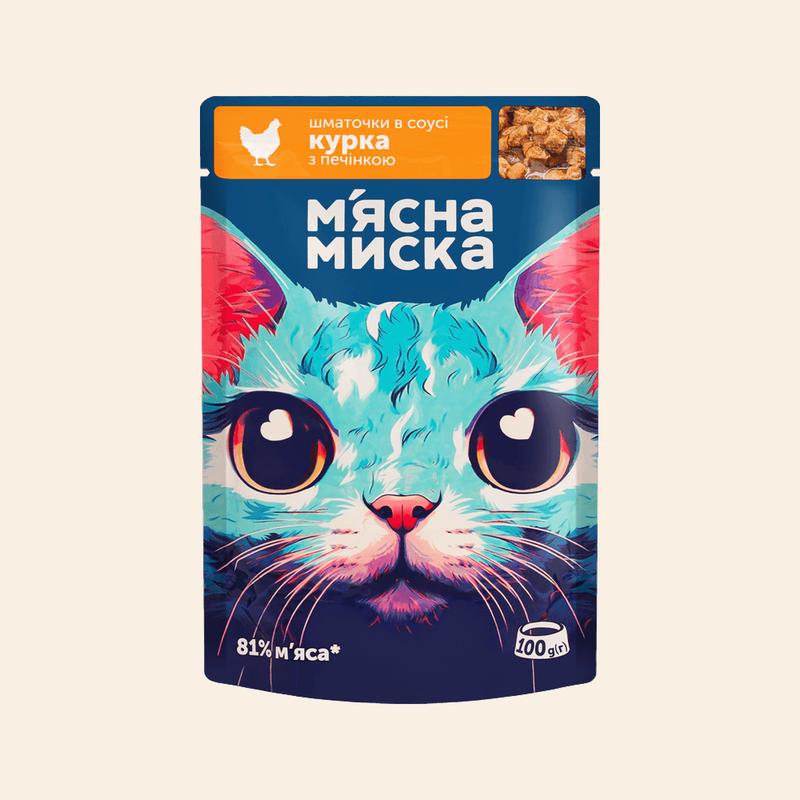 М'ясні шматочки в соусі з куркою та печінкою для дорослих котів м'ясна миска 100г