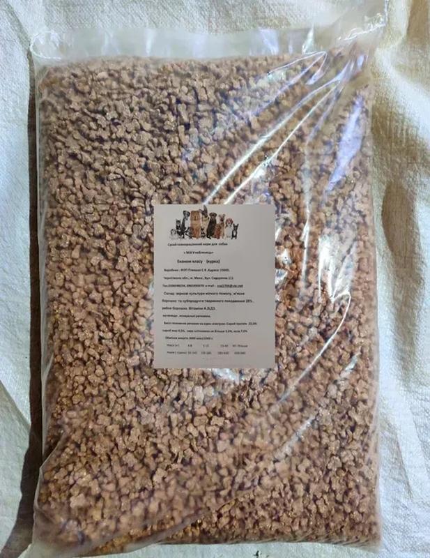 » Мій Улюбленець» Корм розроблено по збалансованій рецептурі та з натуральних компонентів. Має повний комплекс поживних речовин, вітамінів, мікроелементів, антиоксидантів для усіх порід собак. Покращує обмін речовин та зовнішній вигляд тварин, адже здорове харчування запорука довголіття кожного улюбленеця. Сухий корм для собак економ класу зі смаком курки. Склад: зернові культури мілкого помолу, м'ясне борошно та субпродукти тваринного походження 25% ,рибне борошно. Вітаміни А,В,Д3. Вміст поживних речовин на один кілограм: Сирий протеїн 22,0% , сирий жир 9,5%, сира клітковина не більше 3,0%, зола 7,0% вуглеводи , мінеральні речовини. Обмінна енергія 3650 ккал/1000 г. Термін придатності 12 місяців Вага 10 кг - 320 грн.