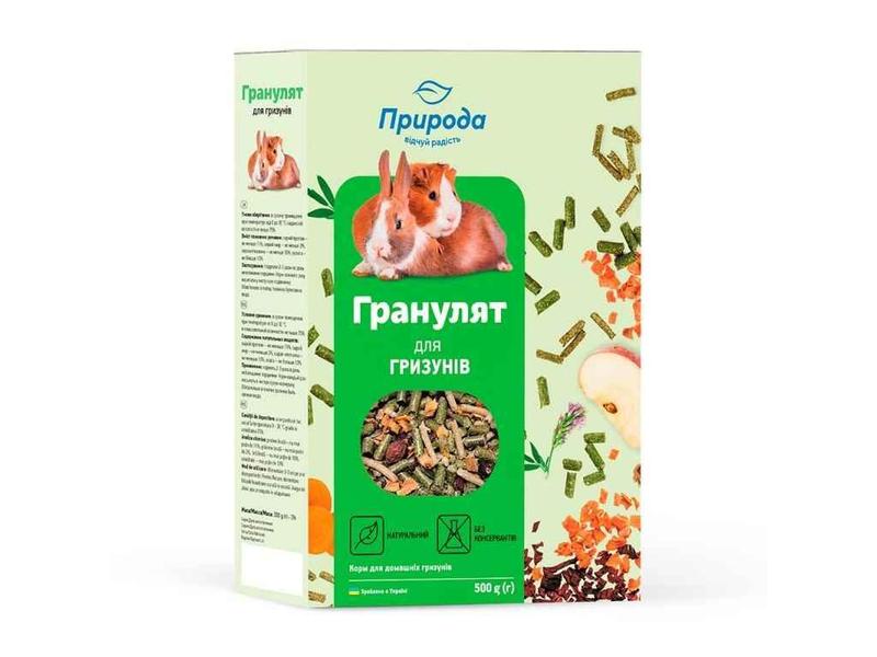 Рецептура корму «Гранулят для гризунів» розроблена на основі рекомендацій провідних фахівців з розведення декоративних гризунів Склад: насіння соняшнику, комбікорм, кероб подрібнений, трав’яний гранулят, сушена морква, сушений буряк, сушені яблука. Базова суміш гранулятів доповнена сухими овочами, фруктами, керобом. Сучасна технологія виробництва гранулятів дозволяє максимально зберегти всі вітаміни та корисні речовини: білки, вуглеводи, антиоксиданти, пектини, незамінні амінокислоти, макро- та мікроелементи. Гранулят можна використовувати як основний корм чи корисне додавання до базового раціону. Тверді гранули дозволяють гризунам сточувати зуби.