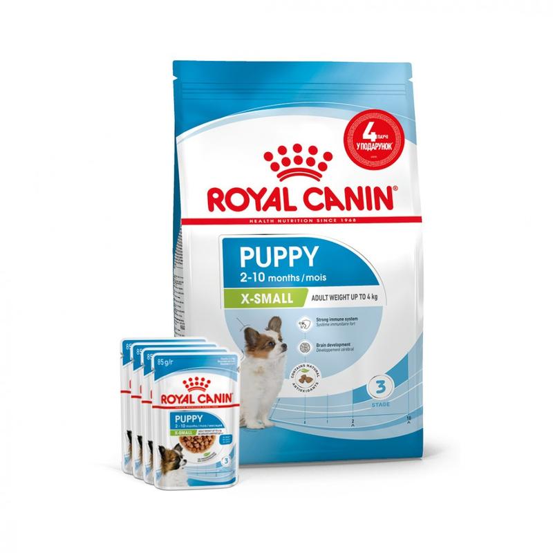 Акция royal canin x-small puppy для щенков миниатюрных пород до 10 месяцев 1.5 кг + 4 пауч...