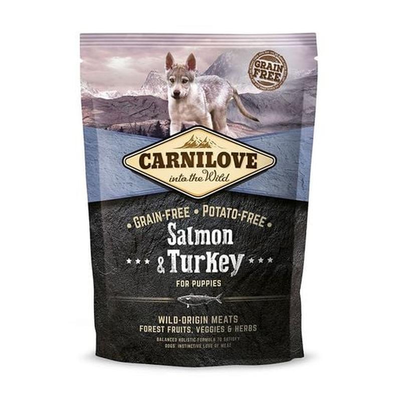 Carnilove Salmon & Turkey — джерело білків, мікроелементів та вітамінів, необхідних для повноцінного розвитку цуценят. Лосось — джерело білків, що легко засвоюються, та ненасичених жирних кислот омега-3, важливих для розумового розвитку, серцево-судинної системи, обмінних процесів, здорового стану хутра та шкіри. Індичка також містить протеїни, що легко засвоюються, а також цинк, вітаміни B3 та B6, важливі для належного функціонування мозку, тонусу м’язів та повноцінного росту Борошно з лосося (25%), борошно з індички (20%), жовтий горох (19%), курячий жир (консервований токоферолами, джерелом вітаміну Е, 10%), гідролізований лосось (5%), гідролізований курячий протеїн (5%), крохмаль із тапіоки (5%), куряча печінка (3%), яблука (2%), риб'ячий жир лососевий (2%), морква (1%), лляне насіння (1%), нут (1%), гідролізовані панцири ракоподібних (джерело глюкозаміну, 0,031%), екстракт хряща (джерело хондроїтину, 0,019%), пивні дріжджі (джерело маннано-олігосахаридів) 0,018%, корінь цикорію (джерело фрукто-олігосахаридів, 0,012%), юка шидигера (0,011%), водорості (0,01%), псиліум (0,01%), чебрець (0,01%), розмарин (0,01%), орегано (0,01%), журавлина (0,0008%), лохина (0,0008%), малина (0,0008%)