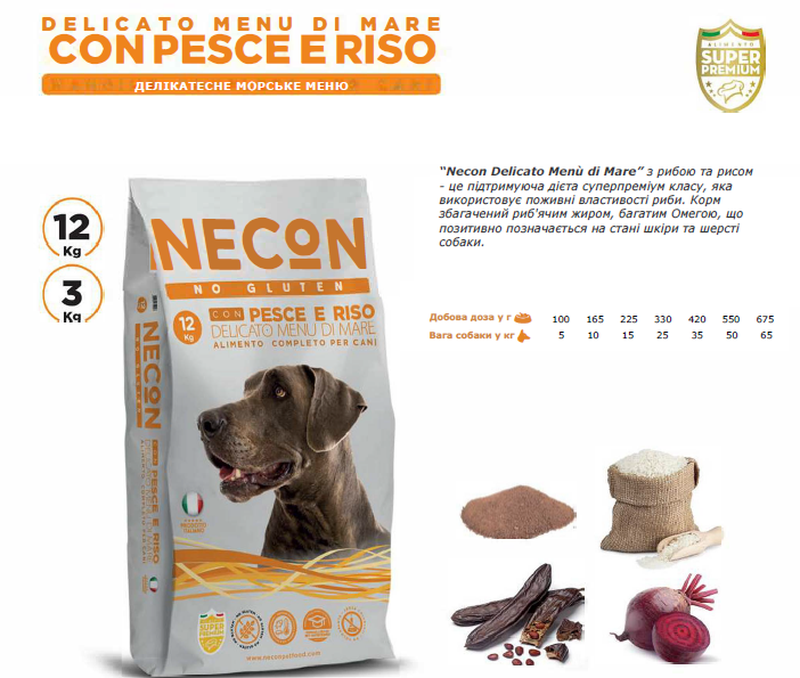 Fish and Rice DELICATE SEA MENU Делікатесне морське меню для дорослих собак “Necon Delicato Menù di Mare” з рибою та рисом - це підтримуюча дієта суперпреміум класу, яка використовує поживні властивості риби. Корм збагачений риб'ячим жиром, багатим Омегою, що позитивно позначається на стані шкіри та шерстісобаки. Склад: зневоднені білки свинини - 25%, цільне зерно кукурудзи, кукурудзяний шрот, сало, рис 7%, знезводнені білки риби 6%, шрот з ріжкового дерева 4%, м'якоть буряка сушена 1,5%, карбонат кальцію, хондроїтин сульфат 78 мг/кг, глюкозамін 78 мг/кг. Аналітичні складові: сирий білок 26,00%, сирі олії та жири 15%, сира зола - 7%, сира клійковина - 2,8%, кальцій - 2%, фосфор - 1%. Харчові добавки: Вітамін А 19100 од./кг, Вітамін D3 1240 од./кг, Вітамін Е 76 мг/кг, Вітамін К3 2 мг/кг, Вітамін В1 6 мг/кг, Вітамін В2 10 мг/кг, Вітамін В6 5 мг/кг, Вітамін В12 0,04 мг/кг, Ніацин 33 мг/кг, Хлорид холіну 1330 мг/кг, Біотин 0,2 мг/кг, Фолієва кислота 3 мг/кг, Пантотенова кислота 60 мг/кг, Таурин 840 мг/кг, L-карнітин 3 мг/кг, Сульфат заліза моногідрат 320 мг/кг (залізо 105,20 мг/кг), Пентагідрат мідного купоросу (мін. 24% МО) 53 мг/кг(мідь 13,4 мг/кг), Сульфат цинку 153 мг/кг (цинк 55,9 мг/кг), Оксид марганцю 76 мг/кг (марганець 32,6 мг/кг), Калію йодид (68% I) 1,9 мг/кг (йод 1,5 мг/кг), Селеніт натрію 0,2 мг/кг (селен 0,10 мг/кг).