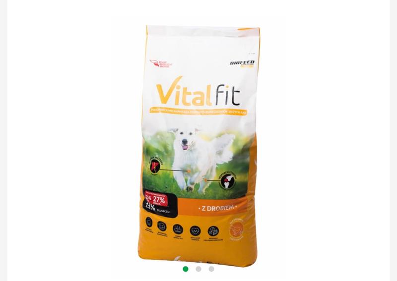 Сухий корм для дорослих собак середніх і великих порід BIOFEED VITAL FIT Adult з куркою. Збагачений вітамінами A, D3, E. Характеристики Вага 15кг Вік собаки Від 12 міс. до 9 років Розмір тварини Великі Середні Вид корму Сухий корм Тип упаковки Мішок Призначення Для активних собак Основне годування Підтримання фізичної форми Основні інгредієнти Курка Країна реєстрації бренду Польща Країна-виробник товару Польща Склад: зернові, продукти рослинного походження, м'ясо і продукти м’ясного походження 40% (в тому числі 36% курятини), олія і жири (в тому числі жир з лосося), мінерали, ензими. Дієтичні добавки в 1 кг: Вітаміни, Про-Вітаміни і речовини подібні за дією (3а): Вітамін А(3а672а) - 14000 МО, Вітамін D3(3a671) - 1000 МО, Вітамін Е(3а700і)-100мг. Вміст мінералів(3b): Цинк (3b605) сульфат цинку 125мг, Залізо (3b103) Сульфат заліза 100мг, мідь (3b405) Сульфат міді 10мг, (3b503) Сульфат Марганцю 5мг, Йод (3b202) Йодид Кальцію 1.5мг, Селен (3b801) Селеніт Натрію 0.2 мг. Добавки технологічні: антиоксиданти, консерванти. Сенсорні добавки: екстракт артишоку (Cynara scolymus L.) 50mg Аналітичний Склад: Білок Сирий ............................................27% Жир Сирий ..............................................15% Клітковина ................................................3,5% Зола Сира ..................................................8% Корм можна давати сухим або залитим теплою водою чи бульйоном. Денна норма залежить від віку тварини, його кондиції, активності і пори року. Привчаючи собаку до корму від БІОФІД, протягом 7-10 днів потрібно давати менші кількості нового корму змішані з попереднім кормом, поступово збільшуючи вміст нового корму. Необхідний постійний і необмежений доступ до свіжої води. Пам’ятайте, що денну норму потрібно розділити мінімум на 2 рази.