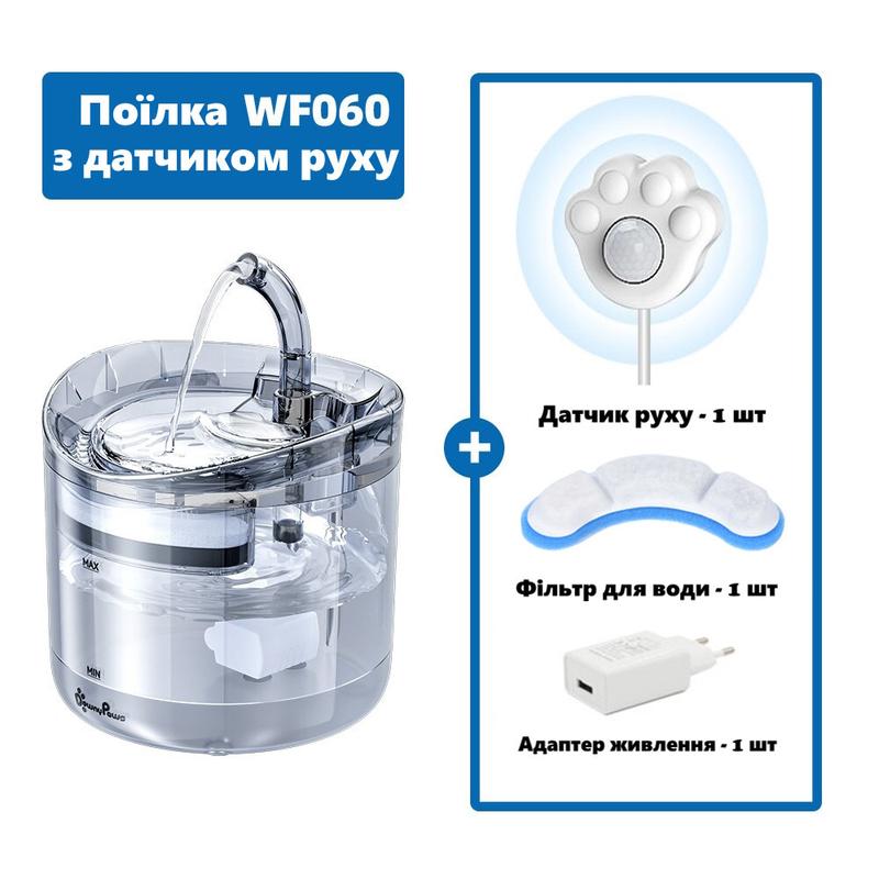 Фонтан-поїлка з циркуляцією та очищенням води для домашніх тварин 2 л Резервуар на 2 л відмінно підходить для невеликих собак, кішок або кількох домашніх тварин. 2 режими потоку води (фонтаном або з насадки, що імітує струмінь із крана), забезпечуючи чисту воду для ваших вихованців на кілька днів за рахунок чого не потрібно постійно стежити за рівнем води у тварин. Переваги автоматичного фонтану для домашніх тварин: - Велика ємність - 2 л Велика ємність для води підходить для різного віку кішок, собак або навіть декількох домашніх тварин. Немає потреби часто поповнювати воду, зберігання води може тривати близько 1 тижня. Тому ви можете залишити вихованців на кілька днів, не турбуючись про забезпеченість тварин водою. Крім того, рекомендується очищати напувалку приблизно раз на 7 днів. - Цей фонтан для води для котів має два режими подачі води, які імітують природне джерело або струмінь води з-під водопровідного крана, які звичні як джерело води для котів, собак та інших домашніх тварин. - Дизайн круглої форми, завдяки якому Ваші вихованці не пораняться і не вдаряться. Прозорість резервуара для води дозволяє легко дізнатися, коли чистити і міняти воду. Щоб ваш вихованець завжди міг пити чисту воду. Завдяки своїй будові легко встановлюється і легко миється. - Нахил площини з водою на 6° легко змиває шерсть, що плаває, і сміття у фільтр для очищення. - Краще підходить для домашніх тварин, щоб пити воду, завдяки зменшенню тиску на шийний хребет вихованця через більш високе положення води (порівняно з мискою води на підлозі) - 3-х шаровий фільтр: 1) губка може ловити котячу шерсть та сміття, 2) шар іонообмінної смоли пом'якшити водопровідну воду, 3) третій шар активованого вугілля видалить поганий смак та запах. Завдяки живленню через USB інтерфейс, може використовуватися з мережним адаптером або з повербанком (не входить в комплект). Поїлка може подавати воду у двох режимах: - Режим фонтану. Широкий м'який режим збільшує вміст кисню у воді. Режим крана Імітація струменя води з-під крана, яка приваблює ваших улюблених кішок і собак, і стимулює пити більше води. Запобігає питтю кішок з-під крана. У конструкції напувалки передбачений резервуар аварійного зберігання води (120 мл) на верхній частині, він необхідний у разі непередбаченого відключення електрики або інших аварійних ситуацій щоб ваші вихованці, як і раніше, мали доступ до води для пиття. Насос для води дуже тихий, рівень шуму якого нижче 40 дБ. Насос має перемикач на 3 положення швидкості потоку води, за допомогою якого можна налаштувати силу потоку води за вашим бажанням. Низьке споживання електрики та простота очищення (насос знімний та замінний). Очищайте його з мильною водою або водою з-під крана. Характеристики Модель: WF060 Матеріал: харчовий пластик Колір: повністю прозорий резервуар для води (ваші вихованці чітко бачитимуть воду) Максимальна ємність: 2 літри Розмір виробу: прибл. 16,5x16,5x15,5 см (Д х Ш х В) Вага виробу: 600 г Рекомендований час заміни фільтру для води: один раз на місяць для досягнення гарного ефекту фільтрації. (Якщо ви використовуєте комплект із датчиком руху фільтр можна міняти раз на 2 місяці) Поради: Регулярно очищайте насос, щоб продовжити термін служби Стандартний комплект включає в себе Напувалка-фонтан для домашніх тварин x 1 шт. Фільтр для води x 1шт. Датчик руху х 1 шт Насадка з