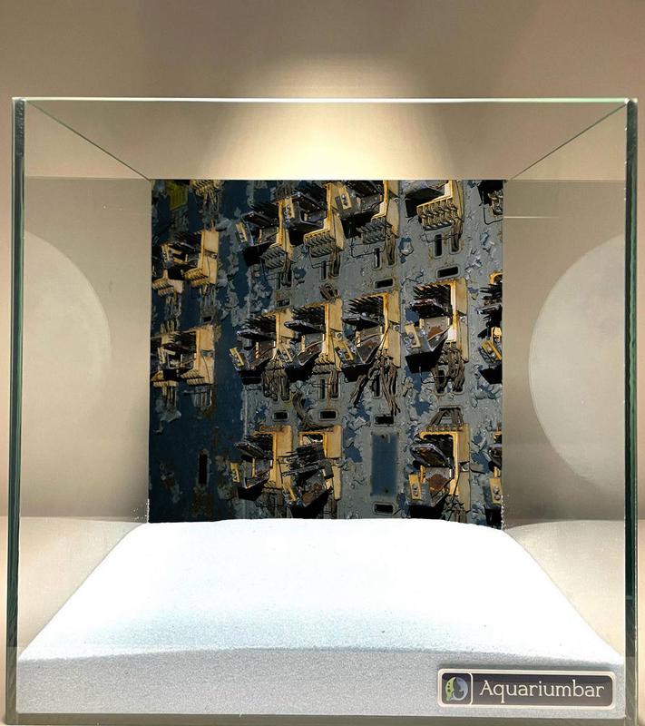 Зображення являє собою акваріум із декоративною задньою стінкою, що імітує старовинні технічні пристрої. Стиль зображення - це стилізація фотографічного зображення, що нагадує графічний дизайн, але без чітких контурів і різких деталей. Колірна палітра переважно сіро-блакитні та бежеві тони з елементами темно-коричневого та золотистого. Не спостерігається явної текстури, характерної для певних мистецьких стилів, але зображення виглядає доволі деталізованим. Композиція задньої стінки - це геометричний візерунок, що імітує складну технічну конструкцію. Використання світла та тіней створює відчуття глибини та об'єму на задній стінці. Матеріал задньої стінки - схоже, це цифровий арт.