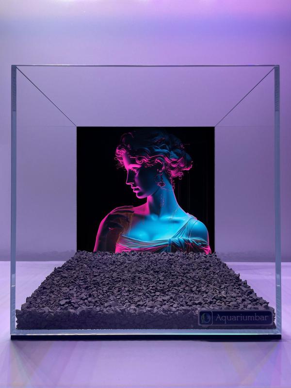 Внутри стеклянного куба размещен отпечаток изображения женщины с подсветкой в сине-розовых тонах. Композиция изображения представляет собой изображение женщины, расположенное в центре прямоугольного куба, создающего впечатление трехмерной картины. Изображение женщины выполнено в стиле, имитирующем скульптуру, и окрашено в синевато-розовые тона. Фон изображения черный, что подчеркивает цветовые акценты на фигуре женщины. Внизу куба находится слой темных камней, которые дополняют общее оформление. Изображение женщины, центральный объект, изображено в профиль, и занимает значительную часть площади. Женщина изображена в синей одежде с кифозом и с прической, которая напоминает греческую или римскую статую. Она имеет нежный, классический вид, и ее лицо обращено немного влево. Ее поза спокойна, с легким наклоном головы. Изображение выполнено с применением цифровых технологий и эффектов. Цветовая палитра и эффекты освещения, такие как сине-розовый контраст, создают художественное настроение, имитирующее подсветку. Техническое исполнение соответствует высоким стандартам, линии и форма хорошо прорисованы. Среда внутри стеклянного куба создает интригующее и необычное ощущение. Черный фон усиливает контраст и акцентирует изображение женщины. Темно-серый гравий, используемый в качестве декора, создает ощущение спокойствия и завершенности композиции. Общее освещение в сине-розовых тонах придает всему изображению художественный и утонченный характер.
