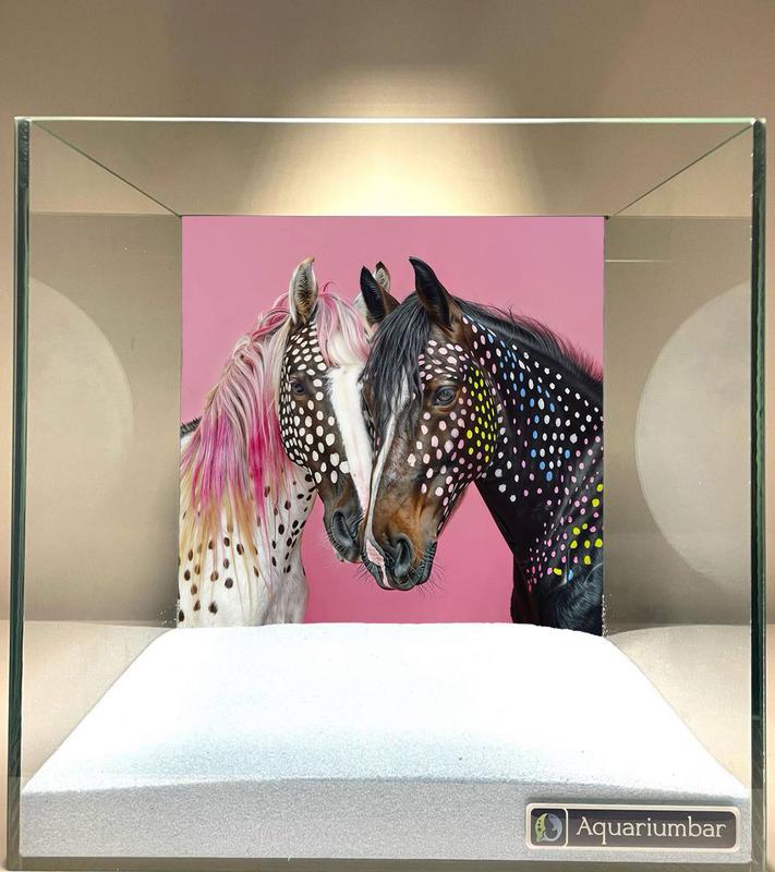 Зображення являє собою фотографію або високоякісний друк двох коней на рожевому тлі. Коні прикрашені яскравими різнокольоровими крапками, що створюють плямистий візерунок. Стиль зображення можна описати як фотореалістичний з елементами декоративного, або, можливо, навіть графічного дизайну. Кольорова гама яскрава і соковита, з акцентом на рожевому, чорному і білому кольорах. Композиція зображення центрована, з кіньми, зверненими один до одного. Відчувається чіткість деталей і висока деталізація в зображенні. Техніка нанесення крапок акуратна і рівна, без видимих слідів пензля чи мазків. Засобом зображення, найімовірніше, є фотодрук або високоякісна репродукція цифрового твору. Видно, що коні перебувають в акваріумі або вітрині.