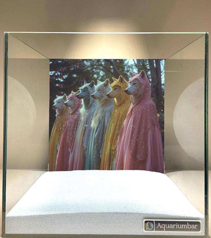 Фотографія являє собою зображення в акваріумі. На фотографії зображені вовки в різнокольорових плащах, які виглядають як вкриті блискітками. Плащі плавно переходять від пастельних тонів до яскравих кольорів. Композиція фотографії нагадує постановочний портрет, де вовки вишикувані в ряд. Стиль фотографії скоріше нагадує художню фотографію, ніж живопис або традиційний китайський живопис. Колірна гамма пастельна, з акцентами на яскравих кольорах. Текстура плащів гладка і блискуча, що зумовлено фактурою покритих блискітками плащів. Загалом, стиль фотографії м'який і романтичний, з акцентом на красі та декоративності. Використання плавних ліній і кольорів створює м'яке і заспокійливе враження.
