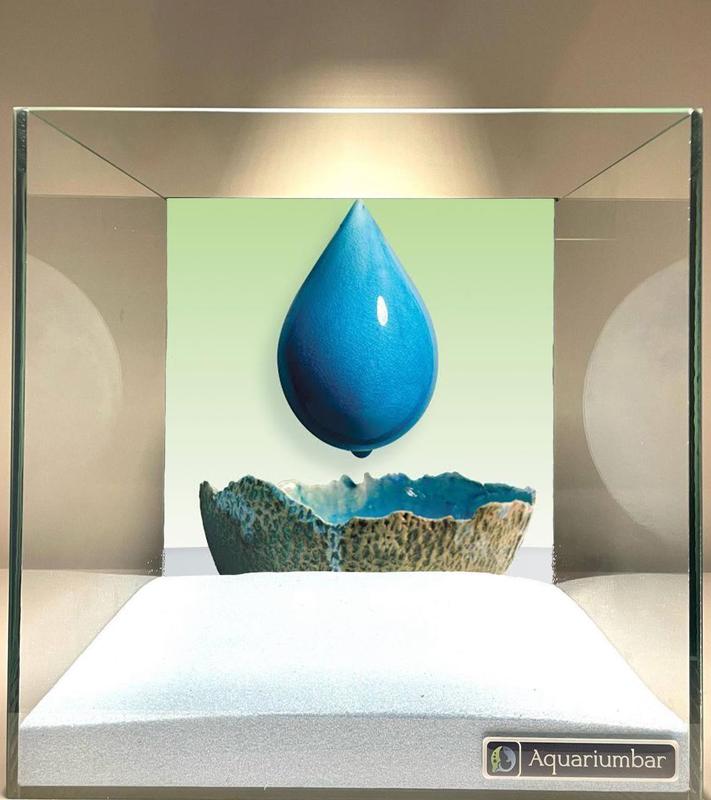 На изображении видна стеклянная витрина, внутри которой расположена синяя капля и чаша. Композиция изображения простая и сосредоточенная. В центре композиции расположена синяя капля, которая кажется падающей в чашу. Капля и чаша -- главные элементы изображения. Пространство вокруг них заполнено нейтральным зеленым фоном. Витрина создает ощущение изоляции и демонстрации объекта. Главные предметы на изображении -- синяя капля и чаша. Капля имеет идеально круглую форму и глубокий сине-голубой цвет. Чаша имеет неровные края и текстурированную поверхность. Ее цвет -- сочетание бежевого и темно- зеленовато-коричневых оттенков. Изображение выполнено в технике цифровой живописи. Стиль изображения прост и минималистичен. Цветовая гамма изображения спокойная и гармоничная. Используются светлые пастельные тона, притягивающие взгляд к синей капле. В изображении преобладает спокойная атмосфера. Световые условия ровные и мягкие. Свет кажется рассеянным, создавая ощущение безмятежности и спокойствия. Витрина используется как рамка, изолирующая объекты от внешнего мира.