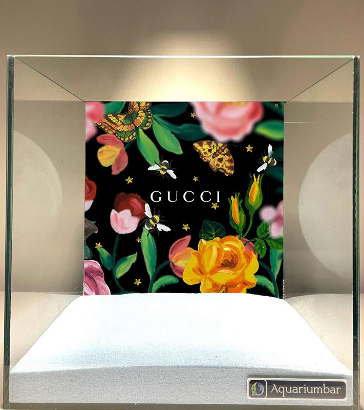 Изображение представляет собой витрину или дисплей, оформленный в стиле графического дизайна с цветочным и бабочковым принтом. На черном фоне изображены цветы, бабочки и пчелы в ярких цветах. На переднем плане находится фон, окрашенный в светлые пастельные тона. Изображение бренда Gucci выделено контрастными черными и белыми цветами, обеспечивая четкую визуальную иерархию. В целом, стиль изображения можно охарактеризовать как декоративный, с акцентом на изобразительном представлении. Используется плоская стилизация фигур и цветочные элементы, а также цветовые палитры, которые не вызывают ассоциаций с конкретными художественными движениями или известными художниками. Видно, что дизайн был создан для брендовой презентации, а не для представления художественной эстетики.