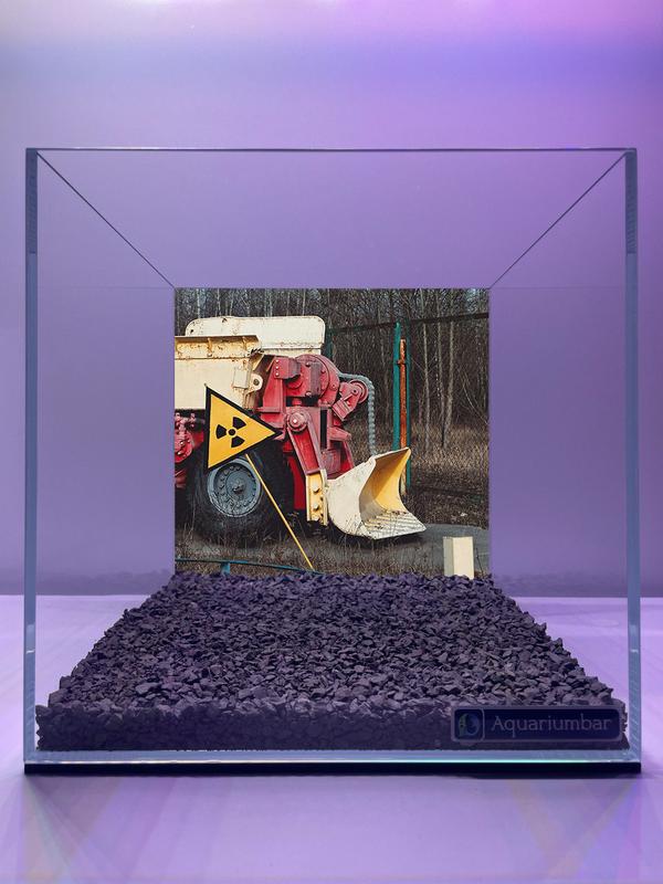 Зображення являє собою акваріум, оформлений як мініатюрна сцена із зображенням старої будівельної техніки на тлі лісу. Стиль зображення можна охарактеризувати як фотореалістичний з додаванням елементів декоративного оформлення. Як фон використовується фотографія, що зображує стару техніку на тлі лісу. Квіти і дерева зображені з реалістичною деталізацією, але з деяким спрощенням форм і текстур. Використані кольори переважно приглушені, з сірими, коричневими і червоними відтінками, що надають зображенню відчуття старовини. Композиція знімка побудована таким чином, що техніка і ліс утворюють природне тло для акваріума. Сам акваріум є прозорим кубом з темно-фіолетовим камінням на дні, і на поверхні акваріума розташована назва бренду. Декоративні елементи, включно з технікою, створюють ефект простору. Загальне враження - це акуратне поєднання фотореалізму і декоративності, що створює стильну і нескладну композицію.