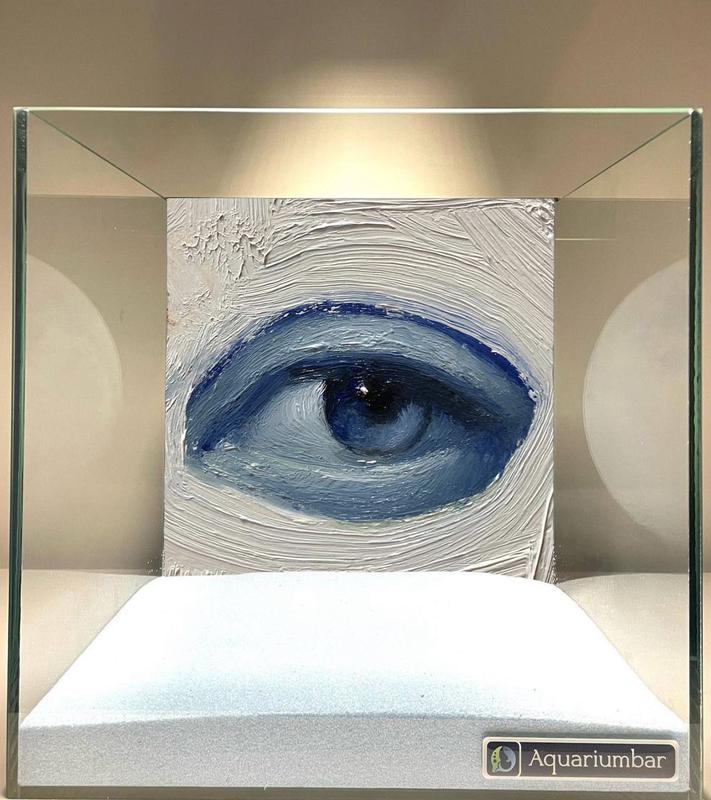 На зображенні представлений портрет ока, написаний у техніці олії на полотні, поміщений в акваріумний бокс. Композиція зображення зосереджена на зображенні ока. Око займає центральне місце в картині, і на ньому сконцентрована основна увага глядача. Картина виконана у світлих тонах, з акцентом на синьо-блакитному кольорі, що надає образу ока спокою і глибини. Картина розташована всередині акваріумного боксу, що надає їй незвичайної рамки та оточення. Головним об'єктом зображення є людське око, виконане в реалістичній манері. Око зображене з глибоким поглядом, у якому відбивається спокій. Колір очей - небесно-блакитний. Накладені мазки фарби створюють ефект глибини та реалістичності. Художній стиль зображення відповідає реалістичному підходу з використанням імпастової техніки. Яскраві колірні переходи на поверхні ока викликають відчуття глибини та об'єму, надаючи зображенню реалістичності. Видно, що художник доклав зусиль, щоб відтворити характерні особливості ока. Обстановка, в якій перебуває зображення, створює особливу атмосферу, що відволікає від суєти навколишнього світу і налаштовує на споглядання. На задньому тлі видно бокс, який слугує рамою для зображення, створюючи ефект занурення у світ картини. Світло падає рівномірно на всю поверхню, надаючи їй м'якості та спокою. Загалом, переважаючий тон - світлий, що створює атмосферу умиротворення і зосередженості.