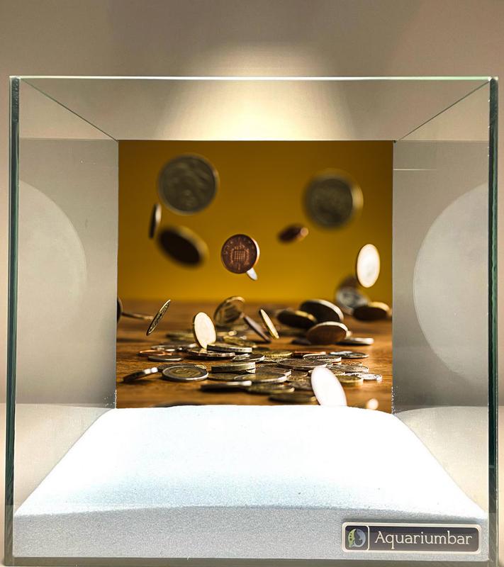 У скляній рамці зображено монети, що падають на дерев'яний стіл. Композиція сцени являє собою зображення безлічі монет, що падають на дерев'яний стіл. Акцент зроблено на динаміці руху монет, створюючи враження падіння і розльоту. Камера націлена на центр композиції, де монети розкидані по столу. Співвідношення сторін і розташування елементів підкреслює момент дії. Моменти зафіксовані в різні фази руху, надаючи динаміку і ритм представленій сцені. Ключові елементи сцени - це монети різних номіналів і розмірів. Монети представляють собою різноманітність металевих відтінків, що надає сцені особливий вигляд. Вони розкидані по дерев'яній поверхні, імітуючи момент падіння. Дерев'яна поверхня столу створює відчуття реалістичності. Художній прийом - це фотореалізм. Техніка виконання професійна. Зображення має точні деталі і реалістичність. Кольорові палітри з жовтим фоном і різними металевими відтінками створюють унікальну палітру. Робоче середовище здається ретельно розробленим. Сцена відбувається на дерев'яній поверхні, яку освітлюють природні джерела світла. Вплив світла підкреслює тривимірну форму монет і робить зображення більш привабливим. Колірна гамма тепла і динамічна, імітує момент в падаючій валюті. Загальний настрій позитивний.