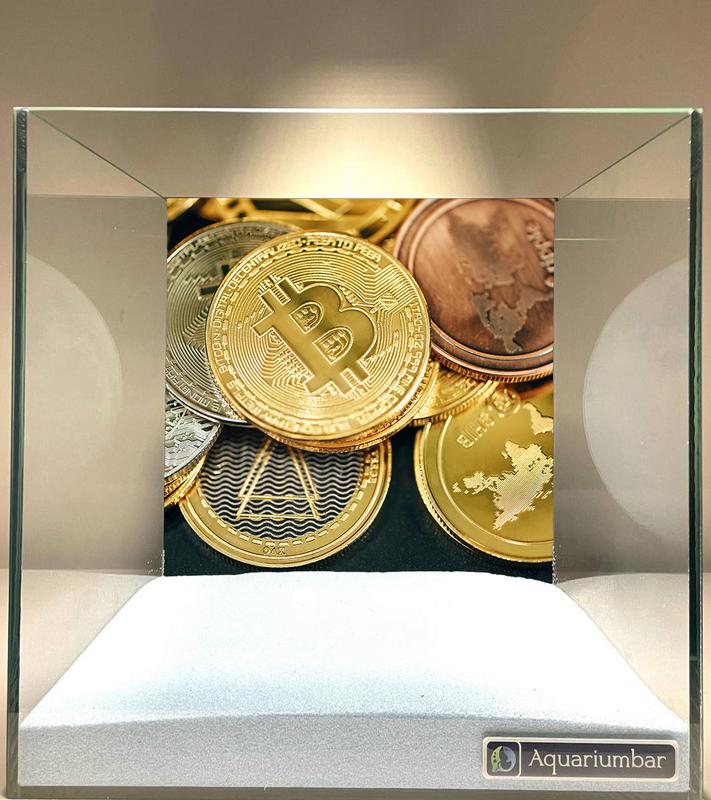 У скляному акваріумі з білим піском зображені різні золоті та срібні монети, в тому числі біткоїни. Композиція зображення являє собою зображення різних монет, таких як біткоїни та інші криптовалюти, розташованих на темному тлі. Монети викладені внахлест, імітуючи безладний куп. Центральне місце займають золоті монети з символом біткоїна. Вигляд зверху, акцент на деталізованих монетах. Представлені предмети - золоті та срібні монети з різними зображеннями та символами. Монети розташовані в центрі зображення, створюючи враження багатства і цінності. Золоті монети виглядають детально, так само як і срібні, показуючи різні символи і текстури. Зображення виконано в цифровому форматі. Стиль зображення професійний, з використанням чітких ліній, ефектів текстури і градієнта. Колірна палітра зображення включає різні відтінки золота і срібла. Кольори зображень монет яскраві і насичені, що привертає увагу. Зображення виконано в стилі модної фотографії, підкреслюючи привабливість монет. Світлові ефекти в зображенні створюють контраст між монетами і фоном.
