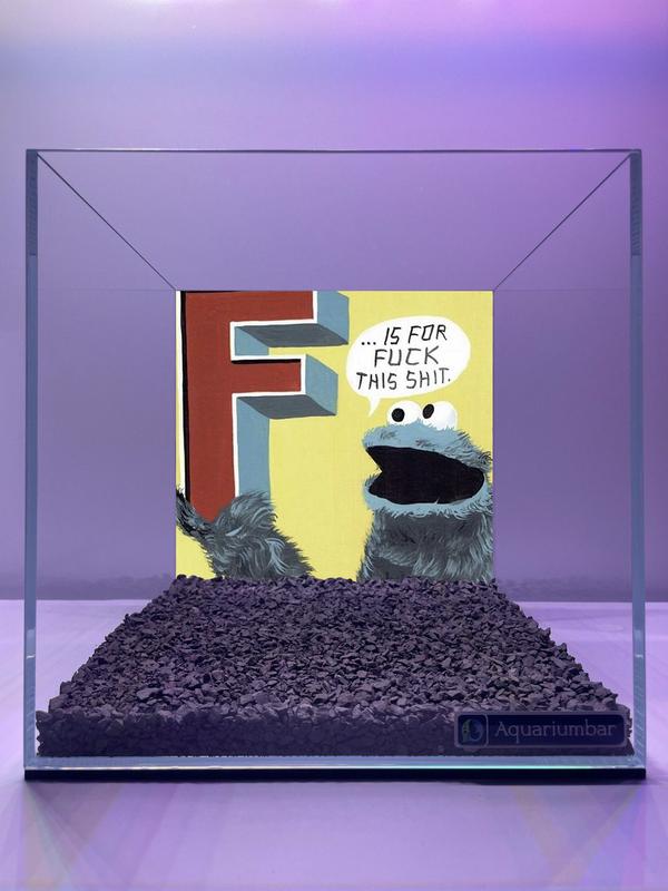 Зображення являє собою акваріум, в якому розміщена картина в стилі коміксу. На картині зображена лялька-монстр Cookie Monster, у стилі, що нагадує старі комікси. Використовується жовта і синя колірна гамма, характерна для коміксів. Стиль зображення плоский, з яскравими кольорами. Малюнок нагадує графічний дизайн, з простими лініями і плоскими кольорами. На зображенні представлений текст, який також намальований у графічному стилі коміксу. Загалом, стиль зображення - сучасне злиття графічного дизайну і зображення коміксу. Зображення укладено в акваріум, який створює додатковий візуальний інтерес.
