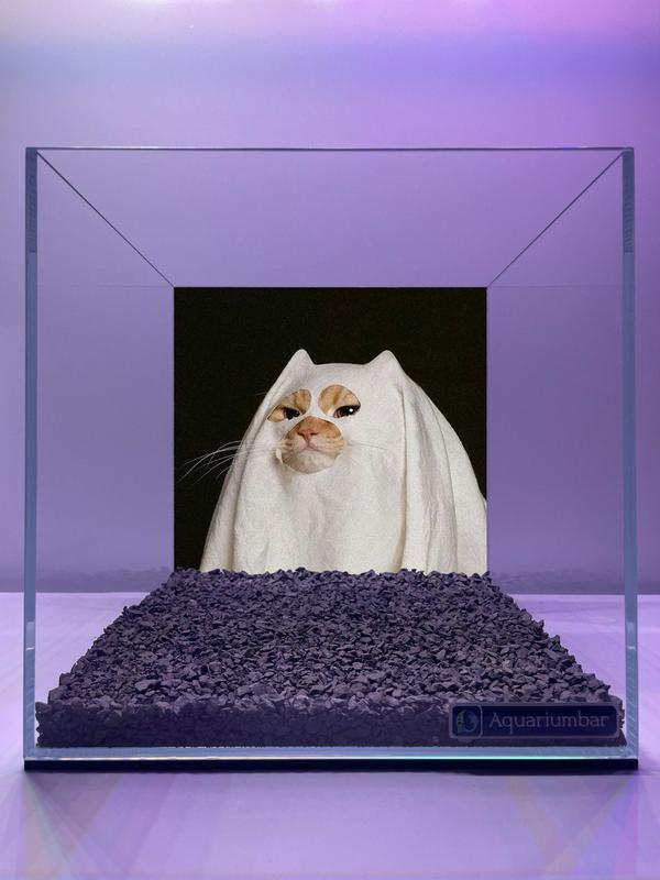 Изображение представляет собой кошку в белой простыне, помещенную в аквариум. Стиль изображения -- это нетрадиционная, ироничная интерпретация художественных приемов, сочетающая в себе элементы современного искусства и юмора. Цвет фона -- нежно-лиловый, а сам аквариум -- прозрачный. Кошка изображена на темном фоне, в белой простыне, похоже на привидение. Колористика изображения -- сдержанная и контрастная: белый цвет простыни резко выделяется на темном фоне, что создаёт ощущение эффекта театральной сцены. Образ приобретает игривую, юмористическую нотку. Композиция довольно простая, сосредоточенная на центральном изображении кошки в аквариуме. Материал изображения -- скорее всего, цифровое изображение, обработанное в графическом редакторе. Использование аквариума как рамы добавляет элемента неожиданности. Стиль изображения -- современный, ироничный, и не предполагает глубокого художественного анализа.