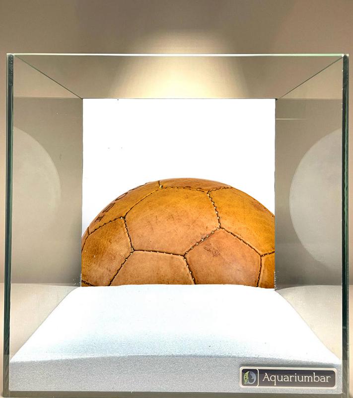 Зображення являє собою старовинний футбольний м'яч, поміщений у скляну вітрину. Стиль зображення можна описати як мінімалістичний і документальний. У зображенні переважає нейтральний колір фону, що робить акцент на об'єкті. Відсутні складні композиційні елементи, квіти або інші декоративні елементи, які могли б вплинути на сприйняття. М'яч - центральний елемент композиції. Його коричневий, потертий від часу вигляд, створює відчуття віку та історії. Матеріал - шкіра. Техніка - це, очевидно, фотографія, яку можна використовувати як референс для AI-генерації зображень, що акцентують на простому показі старовинного предмета.