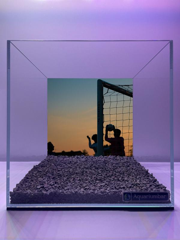 Фотографія являє собою акваріум, у якому зображено вид на поле для гри у футбол у момент заходу сонця. Стиль зображення можна охарактеризувати як мінімалістський і абстрактний. У центрі композиції розташоване зображення людей, що грають у футбол, на тлі заходу сонця. Кольорові плями заходу сонця створюють відчуття спокою. Зображення, поміщене всередину акваріума, передає відчуття відокремленості та концентрації на деталях. Використання скла створює ефект прозорості та ніжності, який підкреслює внутрішнє зображення. Загальна колірна гама включає в себе пастельні відтінки фіолетового і лілового, доповнені теплими помаранчевими і червоними тонами заходу сонця. У зображенні немає складних або яскравих деталей. Загалом композиція зображення створює відчуття умиротворення та спокою. Засобом є фотографія, доповнена використанням оптичних властивостей акваріума.