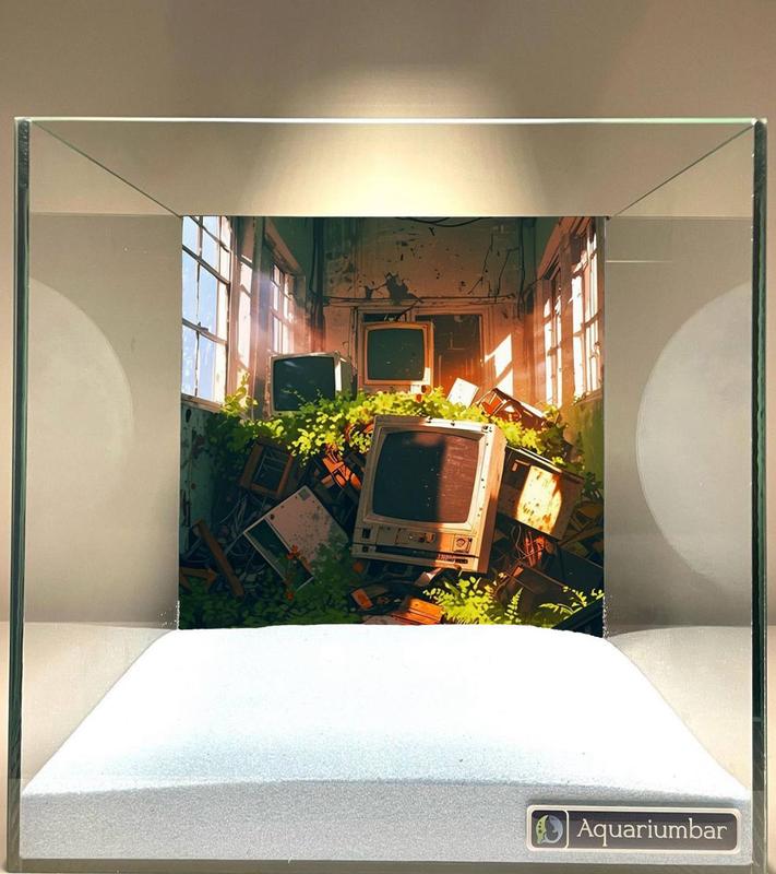 На цифровому зображенні представлений скляний акваріум із зображенням занедбаної кімнати, заповненої старою електронікою та рослинами. Композиція зображення показує внутрішній вигляд занедбаного приміщення, заповненого захаращеною старою електронікою і рослинами. У центрі композиції знаходяться кілька старих телевізорів і комп'ютерів, оточені густими рослинами. Світло проникає крізь вікна, створюючи м'які тіні на розкиданих предметах. У кадрі представлені різні елементи, такі як старі комп'ютери, телевізори та інші предмети, що створюють загальну атмосферу запустіння. Зображення має чіткі лінії та яскраві кольори, які привертають увагу до деталей. На зображенні зображені різні старі телевізори та комп'ютери різного розміру та конструкції. Вони розташовані один на одному та серед рослинності, створюючи відчуття запустіння та старіння. Також видно зарості зелені та диких трав, які проникають у різні частини кімнати та оточують електроніку, надаючи занедбаному приміщенню додаткової атмосфери. Мистецтво виконано в стилі цифрового малюнка, який поєднує в собі деталізацію, реалістичність і трохи спрощення, створюючи приємний і атмосферний настрій. Техніка зображення поєднує в собі реалістичні деталі з характерними для цифрового мистецтва плавними градієнтами та м'якими колірними переходами. Використовується гармонійна колірна гама, яка підкреслює деталізованість об'єктів, використовуючи теплі пастельні тони, що підкреслюють стан спокою та запустіння. Кімната, зображена на картині, має занедбаний і запустілий вигляд. Світло проникає через вікна, створюючи м'які тіні та відблиски на предметах. Загалом, обстановка на зображенні налаштовує на спокійний і атмосферний настрій, підкреслюючи настрій запустіння і спокою. Колір і освітлення створюють приємну атмосферу спокою і меланхолії.