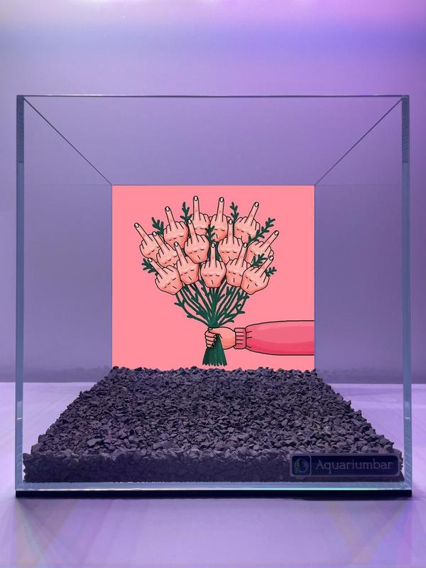 Зображення являє собою графічну роботу, виконану в стилі мінімалізму, можливо, з елементами коміксу або поп-арту. Кольорова композиція зображує букет із рук, що показують середній палець, на рожевому тлі. Стиль малюнка простий і абстрактний. Колірна гама спокійна, з використанням пастельних рожевих і фіолетових відтінків. Відсутні складні текстури. Композиція сфокусована на центральному зображенні букета, а тло і навколишнє середовище (акваріум) слугують для створення декоративного ефекту. Зображення, ймовірно, є цифровим витвором мистецтва з огляду на його яскравість і чіткість.