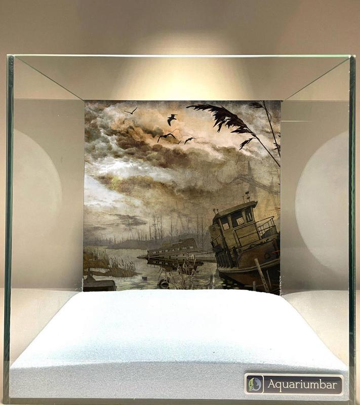 На зображенні зображена акваріумна декорація із зображенням старого судна на тлі туманного пейзажу. Композиція сцени ґрунтується на створенні атмосфери спокою і суворості. Зображення вибудувано так, що на передньому плані розташована біла основа, а на задньому - зображення старого судна на тлі туманного пейзажу. Зображення має виразний акваріумний вигляд. Головні об'єкти - старе судно на річці на тлі туманного пейзажу, і біла основа. Судно зображено з іржавими деталями і в похмурому пейзажі, створюючи атмосферу старовини і запустіння. Біла основа акваріума контрастує з тонами зображення, створюючи контраст і глибину. Зображення виконано в цифровому вигляді. Стиль зображення - реалістичний, з детальним опрацюванням деталей судна і пейзажу. Кольорова гама зображення переважно сіро-коричневих тонів, доповнених сірим і білим кольорами. Техніка виконання професійна, з використанням тональних переходів і текстур. Пейзаж зображений у тумані. Світлові ефекти м'які, що створюють атмосферу спокою і таємниці. Колірна палітра переважно сіра, коричнева і біла. Як фон використовується зображення туманного пейзажу з річкою і старим судном. Загальна атмосфера - спокійна і ніжна, що створює настрій спокою і розміреності.