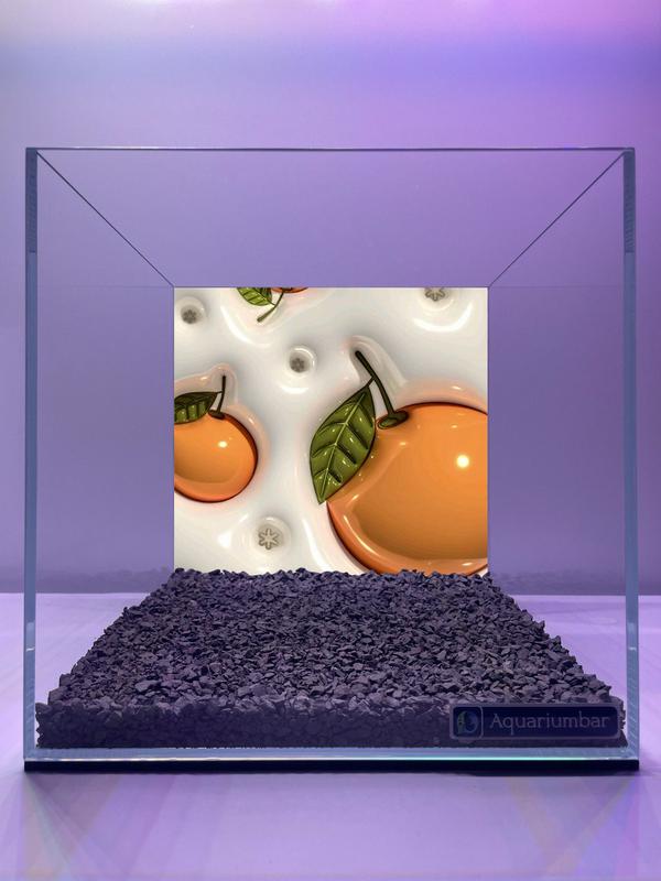 На зображенні зображена акваріумна ємність із незвичайним дизайном дна і стінок. Композиція сцени являє собою внутрішню частину акваріума, в центрі якого розташовані об'ємні зображення помаранчевих плодів з листям. Композиція симетрична, з фокусом на центральному зображенні. Елементи композиції розташовані таким чином, щоб глядач зосередився на картинці всередині акваріума. Ключові елементи - це об'ємні зображення апельсинів і листя, розташовані всередині акваріума на тлі білого кольору. Зображення плодів і листя виконані з використанням колірної гами помаранчевого, зеленого і білого кольорів. Усе має об'ємний вигляд, ніби зроблене із пластику. Художній стиль зображення - це абстрактне 3D-оформлення, з яскравими кольорами та простим дизайном. У зображенні домінують помаранчеві та зелені кольори. Використання об'ємного дизайну і техніки 3D-оформлення надає зображенню унікального вигляду. Акваріум розташований на тлі фіолетового кольору, що контрастує із зображеними плодами. Освітлення м'яке, рівномірне, що не створює сильних тіней, а підкреслює красу об'ємних зображень плодів. Загальне враження від зображення - це незвичайний вигляд акваріума з незвичайним дизайном.
