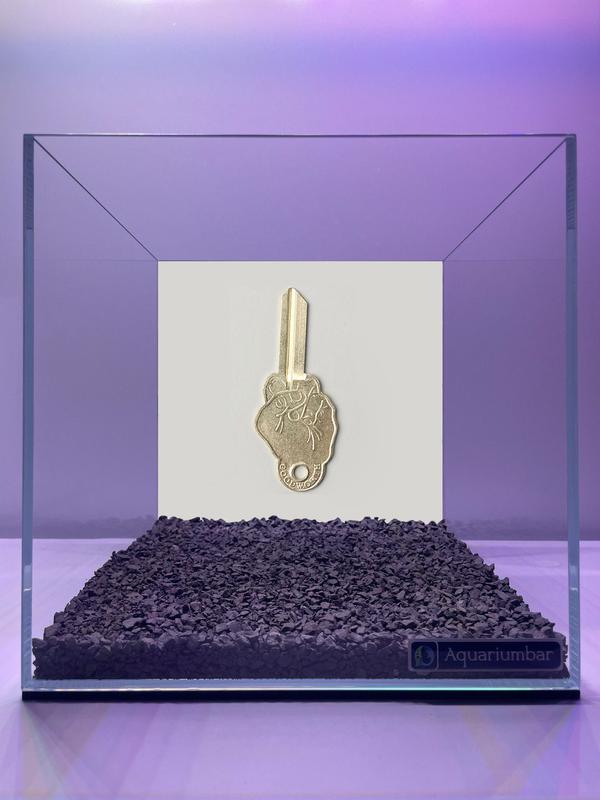 Зображення являє собою предметне фото металевого ключа, зображеного на білому тлі всередині прозорого акваріума або вітрини. Ключ виконаний у вигляді жесту середнього пальця. Колір фону акваріума - ніжний ліловий. В якості основи використовується темний гравій. Загальний художній напрямок радше концептуальний, ніж стилістичний. Використовувані кольори, форма і композиція створюють дивний, інтригуючий ефект. Відсутні складні техніки нанесення або образотворчі прийоми. Предметне тло, колір і форма - основні елементи композиції. Видно, що це фотографія, а не картина, і medium - фотографія.