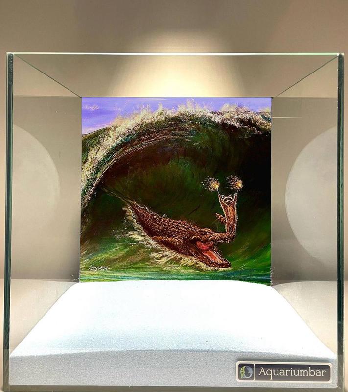 Изображение представляет собой картину, изображающую крокодила, который, кажется, катается на волне, а маленькое животное (вероятно, енот или похожий зверёк) держит в лапах огни. Картина выполнена в реалистичном стиле с акцентом на живописные эффекты. Цветовая палитра яркая, но не кричащая. В работе заметно использование мазков кисти для прорисовки волны и окружающей среды. Структура и фактура элементов, такие как вода, волны и сам крокодил, выражены с определенной детализацией. Композиция картины хорошо сбалансирована, а изображение расположено в центре. Работа, возможно, выполнена в цифровом формате или акрилом на холсте. Картина представлена в стеклянном аквариуме или витрине с белым песком в основании.