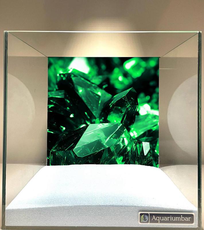 Изображение представляет собой аквариум с декоративным задником, изображающим множество зелёных кристаллов. Стиль изображения -- фотореалистичный, с ярким насыщенным зелёным цветом и чёткими деталями кристаллов. Отсутствие заметной кисти или художественных эффектов указывает на то, что изображение представляет собой тщательно обработанное фото. В целом композиция сфокусирована на центральной группе кристаллов, обрамлённых нейтральным серым и белым фоном. Использование стекла аквариума придает изображению ощущение глубины и прозрачности. Детализированное изображение кристаллов передаёт ощущение текстуры и блеска. Средство изображения -- фото, обработанное для визуализации в аквариуме.
