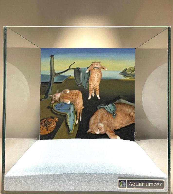 На изображении представлен аквариум, оформленный в виде репродукции картины "Постоянство памяти" Сальвадора Дали. Картина напечатана на прозрачной пленке, установленной внутри аквариума. На переднем плане аквариума изображен слой светлого синеватого песка. Художественный стиль картины имитирует реалистичные образы Сальвадора Дали, с акцентом на парадоксальных ситуациях и образах. Яркие цвета и сочетание реализма и абстракции в картине, сосредоточены на сюжете, изображающем котов. Композиция включает в себя множество элементов, создающих сложный образ. Стиль картины очень декоративен. Использована реалистичная техника изображения котов и абстрактный подход в изображении часов и среды. Средством изображения, вероятно, является печать на прозрачном материале, установленная внутри аквариума.