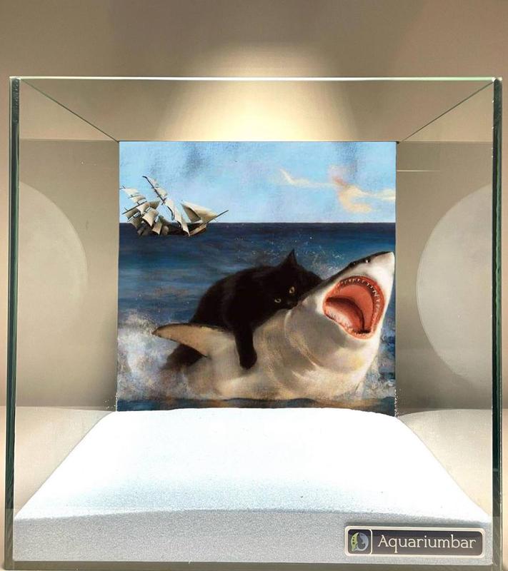 Изображение представляет собой аквариум с декоративным основанием, на котором изображена картина в стиле реалистичного искусства. Картина изображает сцену, где черная кошка сидит на спине акулы в океане. Стиль напоминает реализм, с тщательным изображением деталей и текстур воды, корабля и животных. Цветовая гамма спокойная и реалистичная, с использованием разнообразных оттенков синего и голубого для океана. Текстура на картине имитирует масляную живопись с мягкими переходами между цветами. Композиция картины симметричная, с фокусом на взаимодействии кошки и акулы. Используемый метод -- это, вероятно, цифровая обработка изображений, возможно, с применением техник, имитирующих масляную живопись. Картина в аквариуме создает контраст между спокойствием воды и динамикой сцены.