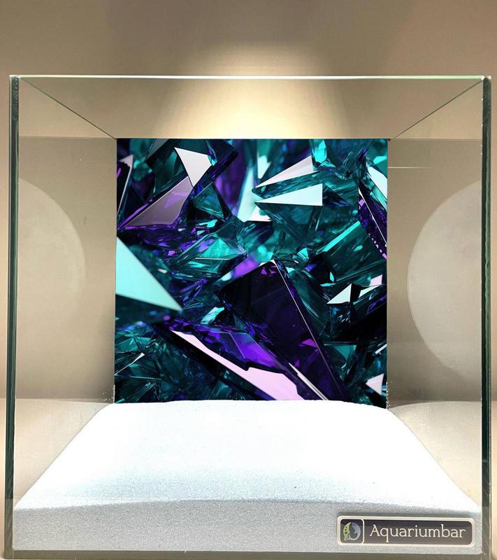 Зображення являє собою акваріумний декор із зображенням осколків дорогоцінних каменів глибокого синьо-фіолетового і зеленого кольорів. Стиль зображення - це сучасний, геометричний абстрактний дизайн. Немає явної прив'язки до певних художників або мистецьких напрямів, крім, можливо, стилів, орієнтованих на абстракцію та геометрію. Малюнки створені за допомогою програмного забезпечення, а не традиційних методів живопису. Кольорова палітра яскрава і насичена, що поєднує в собі різні відтінки синього, фіолетового і зеленого. Текстура має гладкий вигляд і віддзеркалює, імітуючи форму та блиск дорогоцінного каміння. Композиція динамічна, з численними осколками і складною геометрією. Використовується цифрове зображення або фоторедагування.